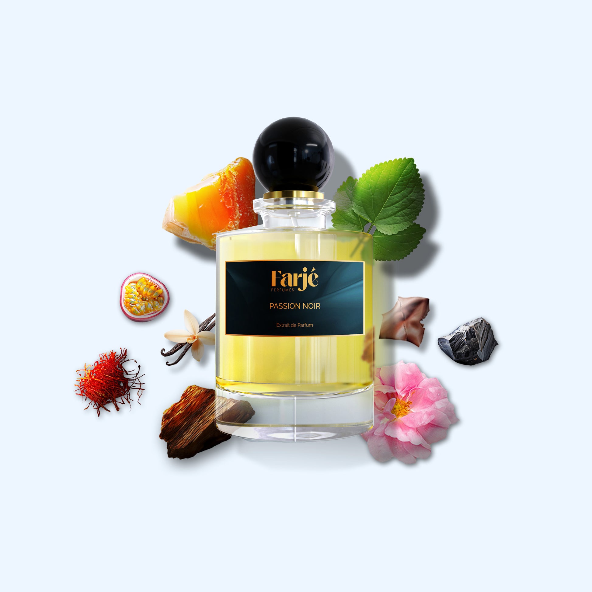 An exotic, sensual perfume opens with the tangy sweetness of passion fruit and a medley of tropical fruits. This vibrant chorus is intertwined with Turkish rose, its petals lush and spicy, and a dash of saffron that adds a golden warmth. At its core, the fragrance deepens with the resinous depth of oud and the earthy richness of patchouli, smoothed by the balsamic sweetness of benzoin. As it dries down, supple leather and amber create a warm, animalic embrace, enriched by labdanum's dark resin and a whisper of vanilla. This composition oscillates between bright fruit, opulent florals and deep, smoky woods, offering a journey that is both captivating and sophisticated.